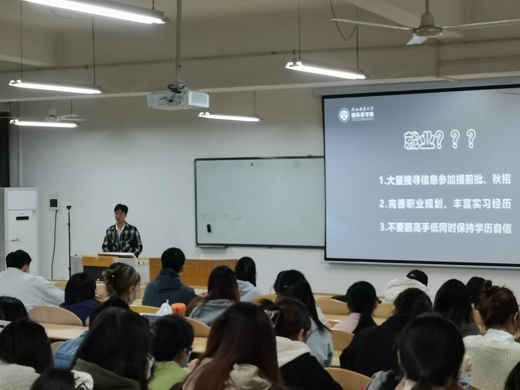会上,杨杰克作了题为“青春领航 职启蓝图”的励志主题演讲,他以自身的经历为例,从未来职业规划、知识掌握水平、保持专注力等方面为大家介绍了求职过程中的注意事项。他建议同学们要大量搜集信息,积极参加提前批和秋季招聘会,同时不断完善职业规划,丰富实习经历,保持学历自信。最后,杨杰克鼓励同学们大胆尝试、勇敢探索自己的人生道路。