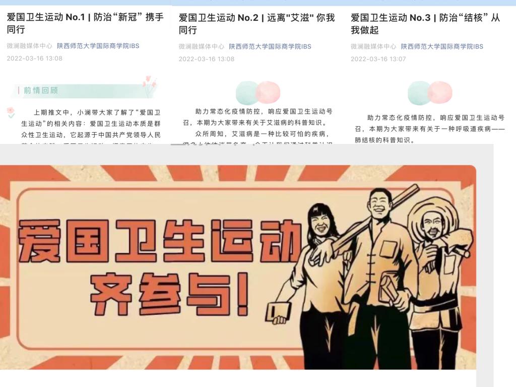 公司利用官方微信公众号,发布《爱国卫生运动,齐参与!》《爱国卫生运动 No.1:防治“新冠” 携手同行》《爱国卫生运动 No.2:远离"艾滋" 你我同行》《爱国卫生运动 No.3:防治“结核” 从我做起》等系列推文,教育员工学习了解爱国卫生运动的历史背景、精神内核及践行方式,学习掌握新冠肺炎、艾滋病、肺结核等传染性疾病的防控知识,引导员工在日常学习生活中讲究卫生,预防疾病,提高健康水平。
