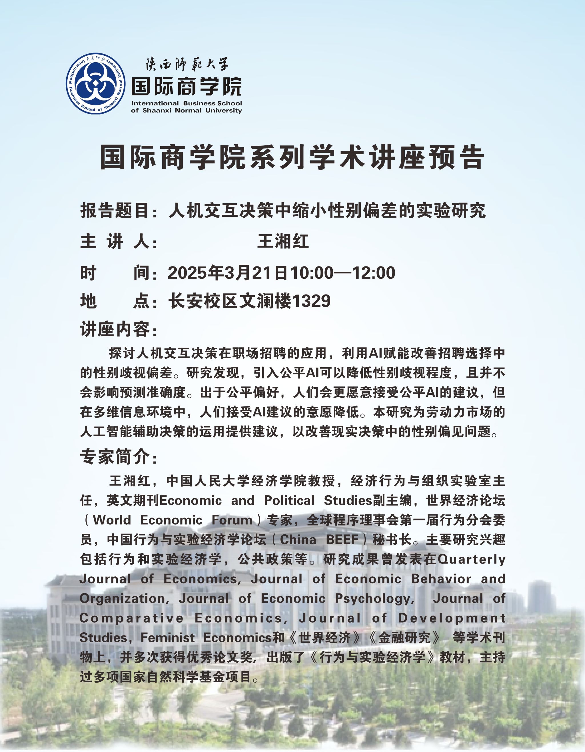 学术讲座预告——人机交互决策中缩小性别偏差的实验研究