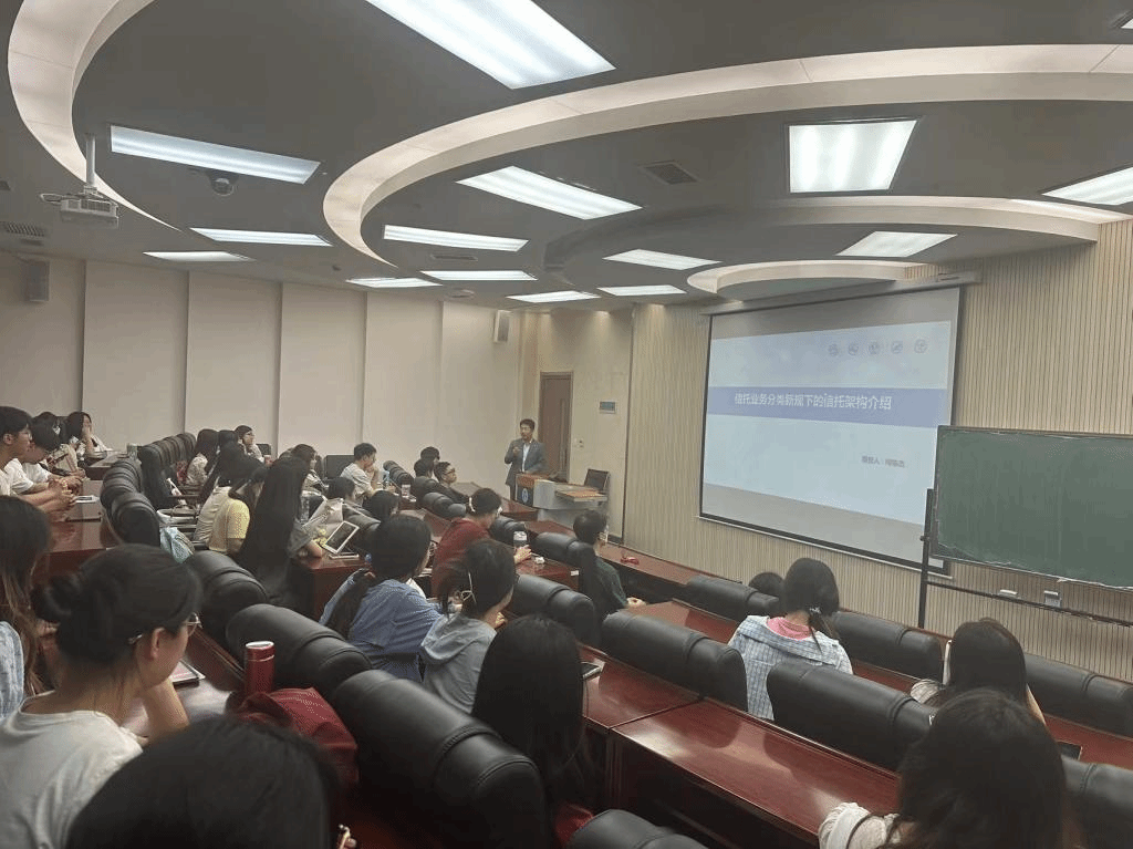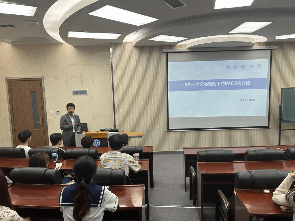 讲座伊始,闫先生以贾跃亭和张兰这两位公众人物的家族信托为例,通过对比激起了同学们对信托的好奇心。之后,闫先生纵观古今,用通俗易懂的语言解释了信托的内涵与基本原理,并结合《中国银保监会关于规范信托公司信托业务分类的通知》文件要求,全面梳理信托业务分类新规下的信托业务架构体系,系统的分析信托工具的特点及功能。在信托的三大类业务中,闫先生结合时事,将资产服务信托作为重点,对细分的四种信托业务分别从定义、交易结构、特点及应用场景等方面做了介绍。此外,针对资产管理信托和公益慈善信托两大类业务,通过相关政策文件及相关法规向同学们详细讲述当前的发展现状,并预测未来业务的发展趋势。同时将经典案例融入了讲座之中,使讲座生动之余也让同学们对信托行业有更加深入的了解。