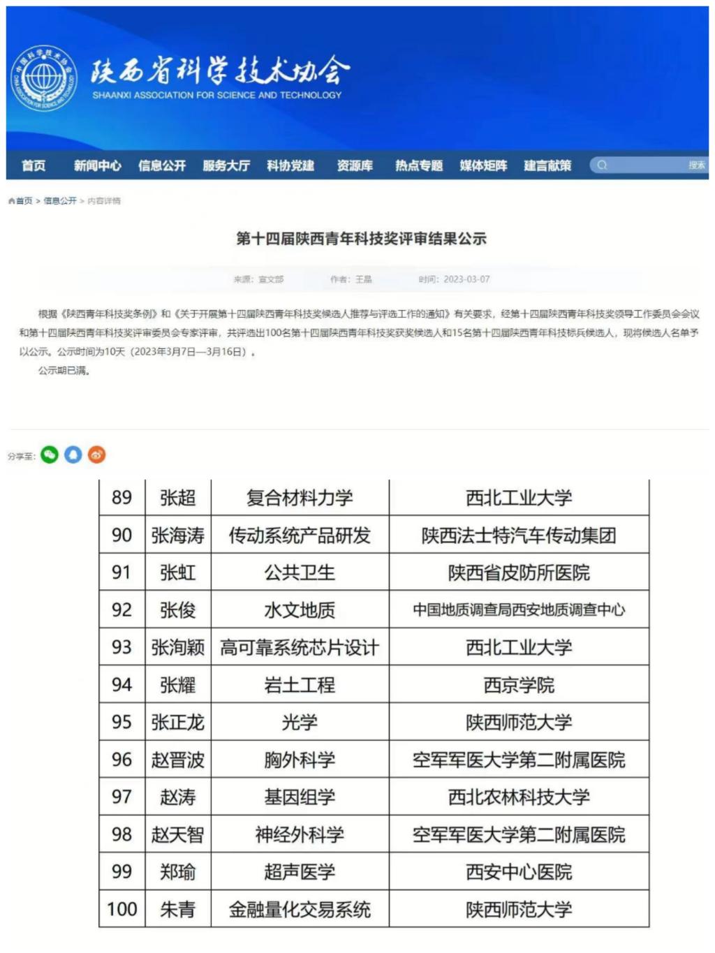公司特聘教授朱青,在2022年度经由365体育推荐参评“第十四届陕西青年科技奖”的评选,在工学组“计算机与过程控制”领域的科学研究方向表现优异,2023年2月经过省外函评,评议委员会推荐、评价等环节,获得“第十四届陕西青年科技奖”提名,并公示通过。陕西青年科技奖,每两年评选一次,是陕西省有重要影响的科技奖项,旨在表彰陕西省青年科技工作者的杰出代表,特别是科研生产一线、基层、非公有制经济组织中取得突出成绩,并为陕西省的经济社会发展做出积极贡献的青年才俊。陕西青年科技奖主要表彰未满40周岁的科学研究、工程应用方面的省内优秀青年专家,也是中国青年科技奖参评的唯一渠道。