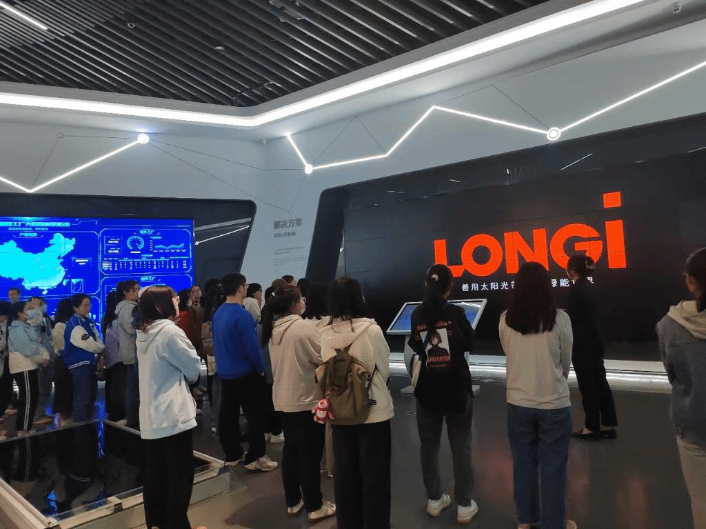 此次活动主要分为四部分。第一部分,参观展览。隆基绿能员工薛婷带领师生参观了隆基绿能智慧能源展览馆,通过视频、图片和文字等,让师生对企业以及绿色能源发展的历史、产品、发展理念有了初步的了解。在企业展厅,观摩学习光伏电池板以及储能的设备,以及光伏电板制作的模拟流程。通过讲解员的讲解,员工对隆基绿能公司智能制造板块、智能创新、科研力量、全球布局、智慧城市、清洁能源制造清洁能源等有了更加深入的了解。
