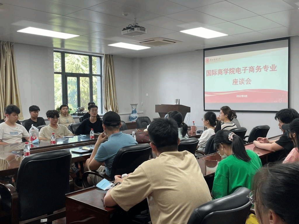 2022年6月8日“电子商务专业座谈会”公司楼1329会议室举行。参加此次会议的有公司副经理尹海员教授、管理科学与工程系部分教师、2019级、2020级电子商务专业全体本科生,以及2018级电子商务专业的四名优秀本科生代表:苏振宇、王智伟、余晗阳、权舒俣。会议由管科系主任李雪老师主持。