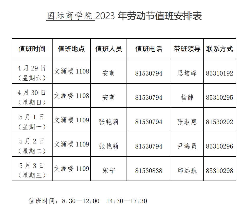 2023劳动节值班表
