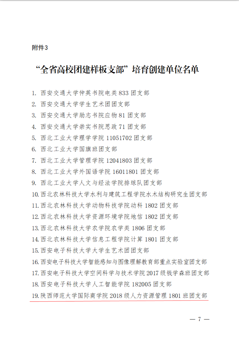 近日,共青团陕西省委、中共陕西省委教育工委联合下发《关于公布第一批全省高校团建示范院校、标杆院系、样板支部培育创建单位名单的通知》,公司2018级人力资源管理1801班团支部入选“全省高校团建样板支部”培育创建单位。